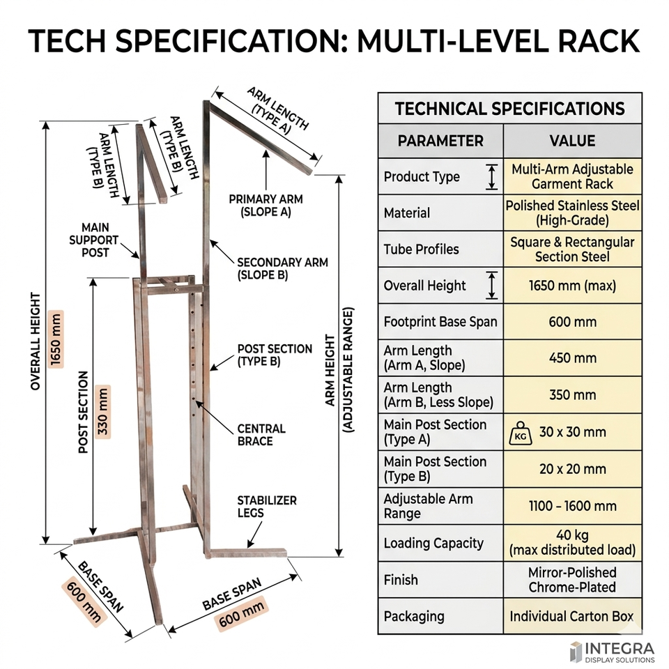 Présentoir pliable robuste pour vêtements Bros Display, en métal chromé, portable, amovible, pour la vente au détail, OEM ODM Vietnam