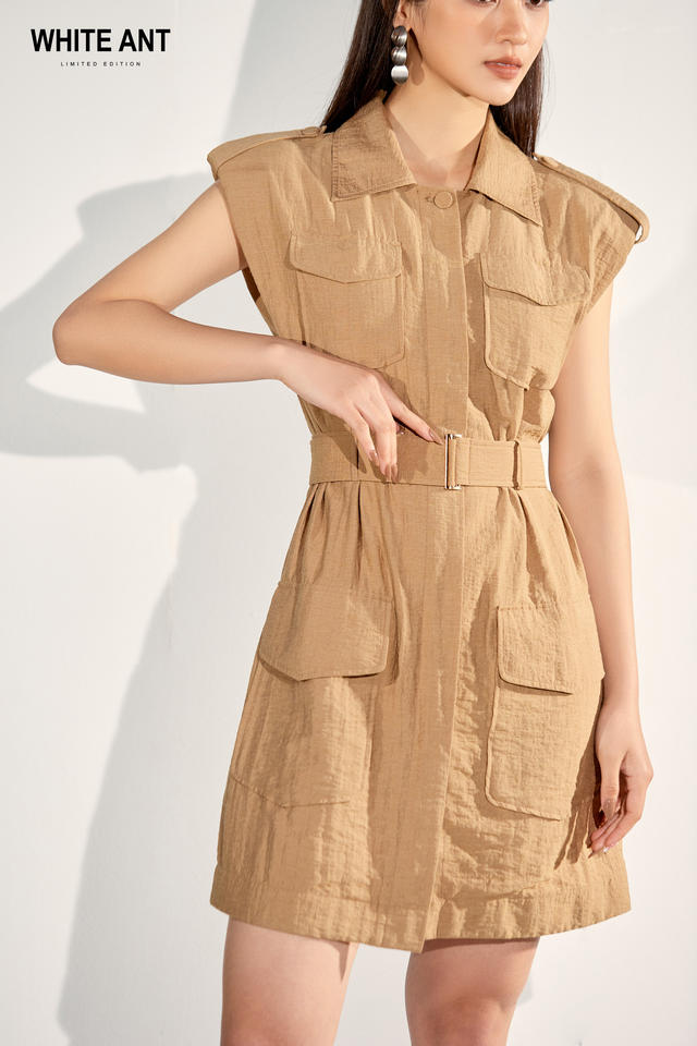 Brown A-line Dress Women Linen Rayon Nylon Material Elegant WHITE ANT Women Clothing Manufacturer Hot Trend Sappo Safari Dress