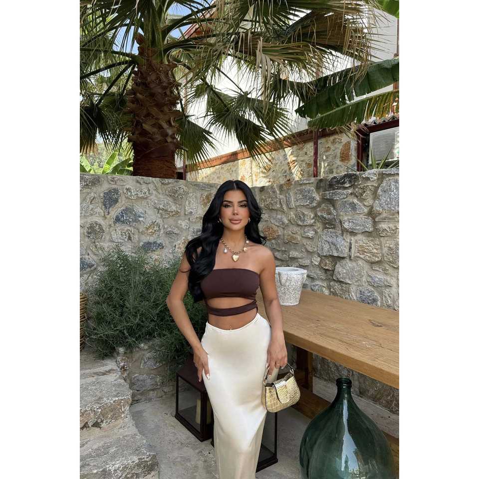 Body marron basique avec détail fenêtre, coupe ajustée décontractée, longueur au-dessus du genou, saison automne-été, manches courtes, décoration boutonnée