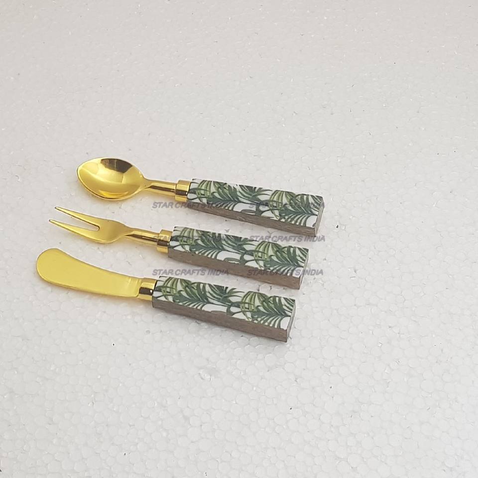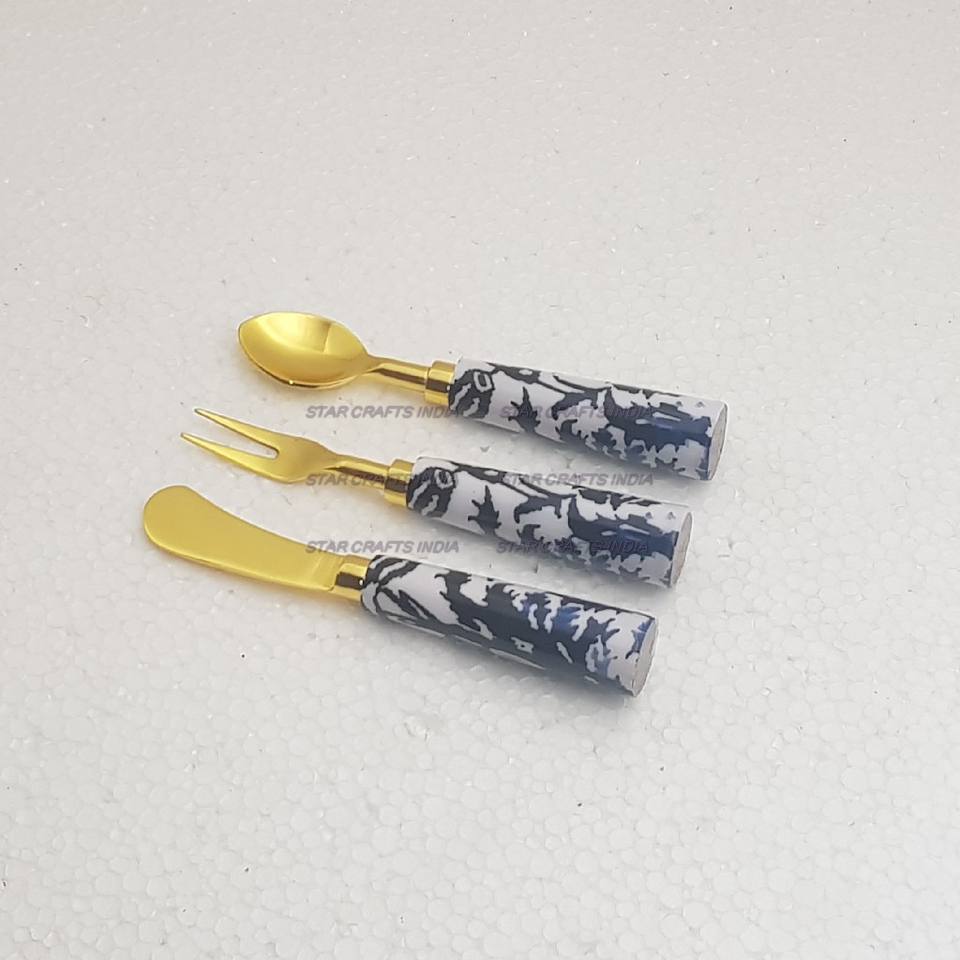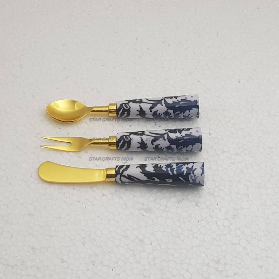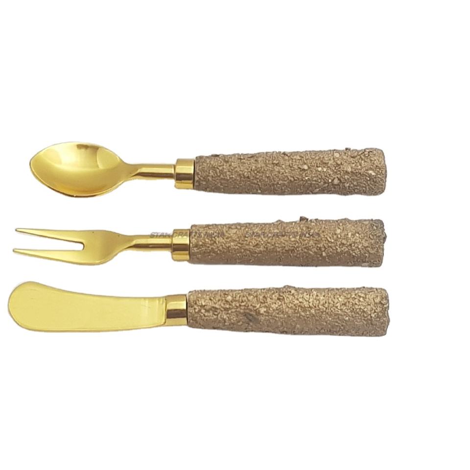 Brown Graver Stone Handle With Golden Plated Stainless Steel Cutlery Spoon Fork & Knife Set of 3 Pcs Flatware Set Cutlery Set