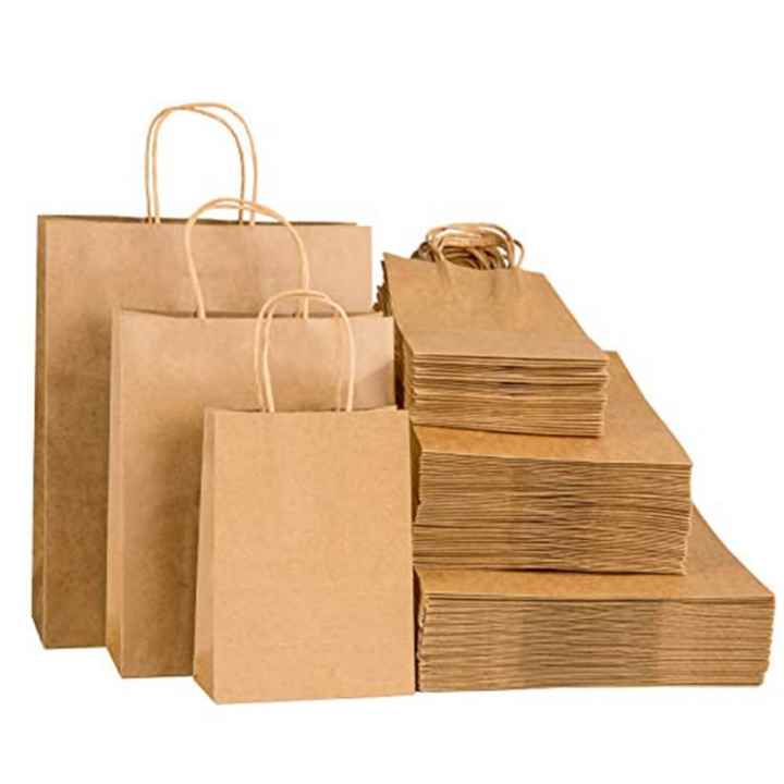 Sacs en papier kraft brun avec poignées, sacs en papier pour plats à emporter, sacs d'emballage pour livraison, services personnalisés offerts.