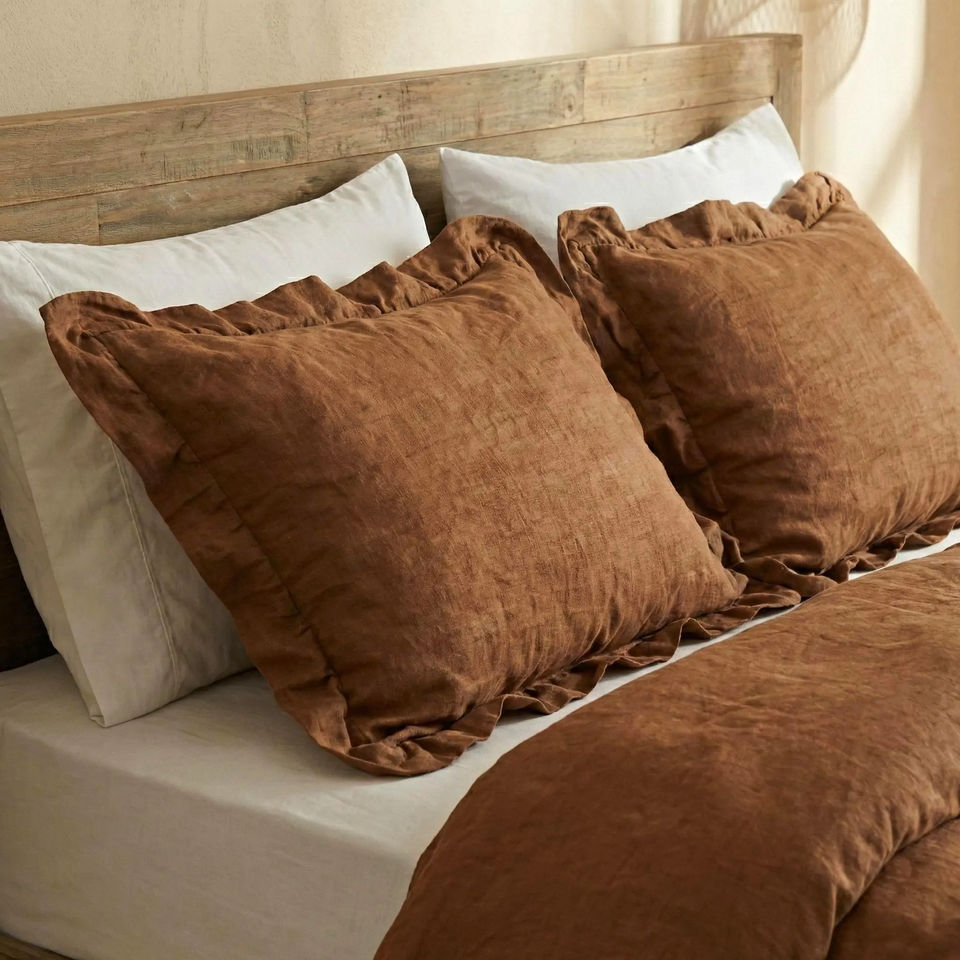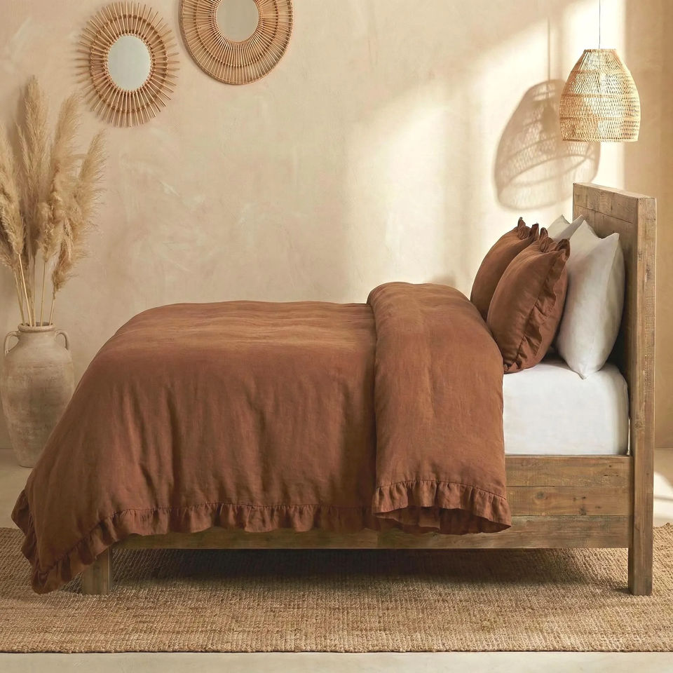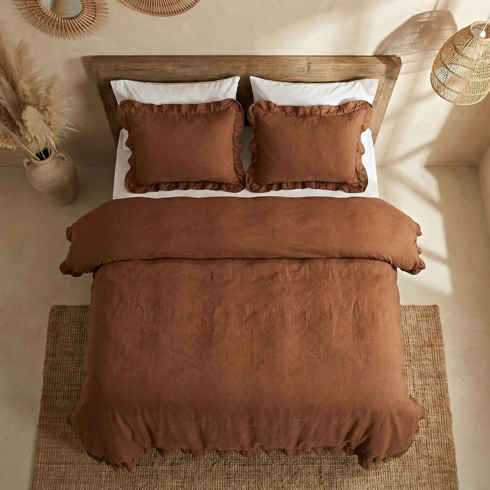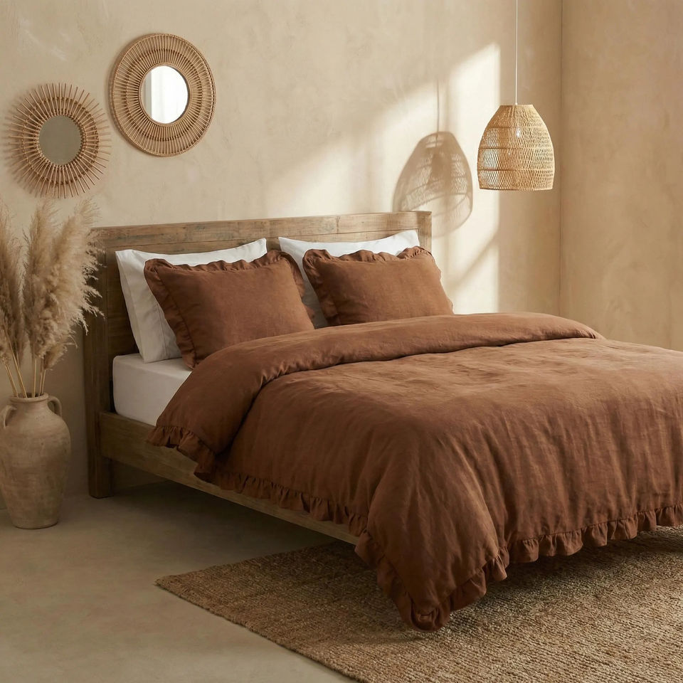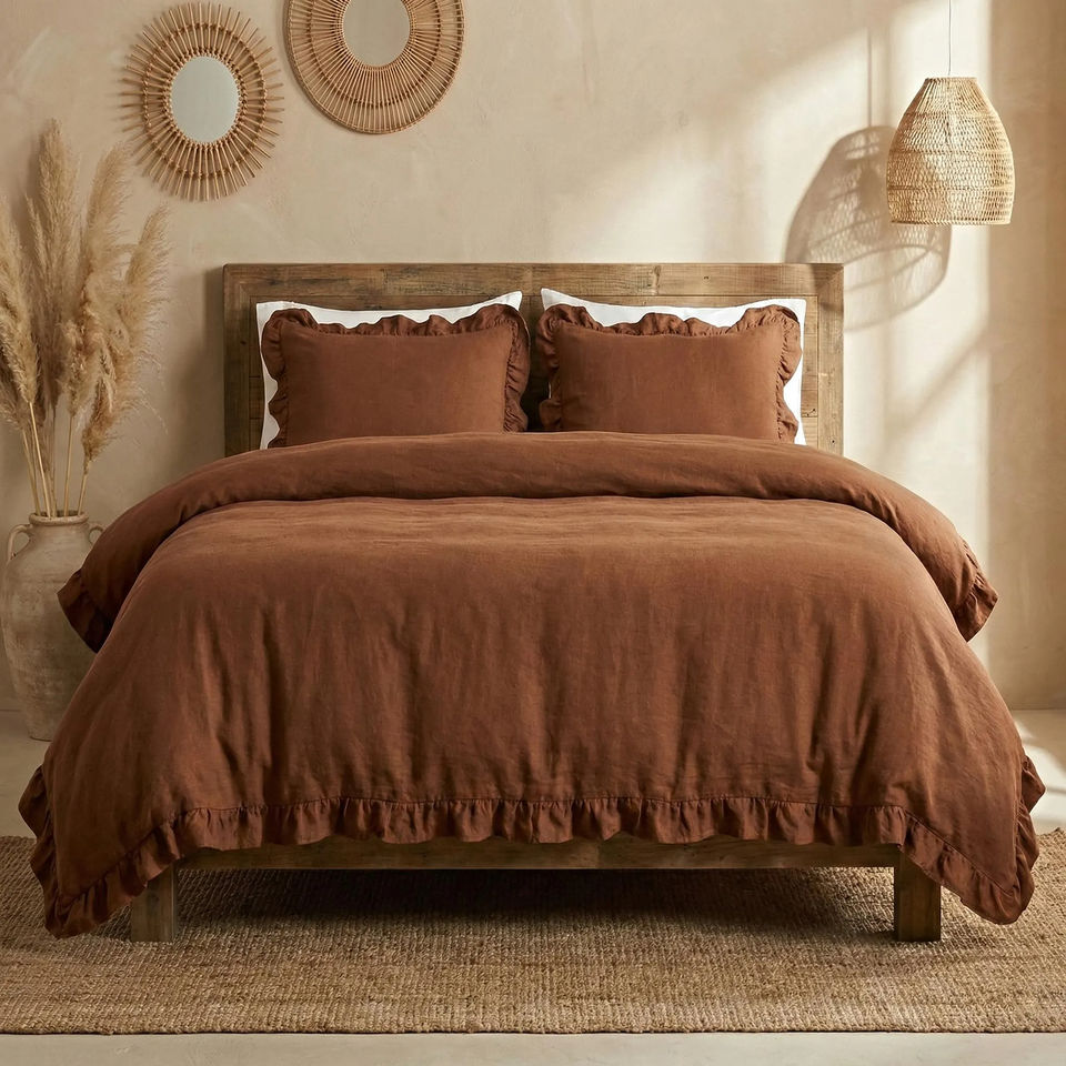 Housse de couette en lin brun avec bordure à volants, ensemble de literie en lin lavé doux, décoration de chambre rustique style ferme