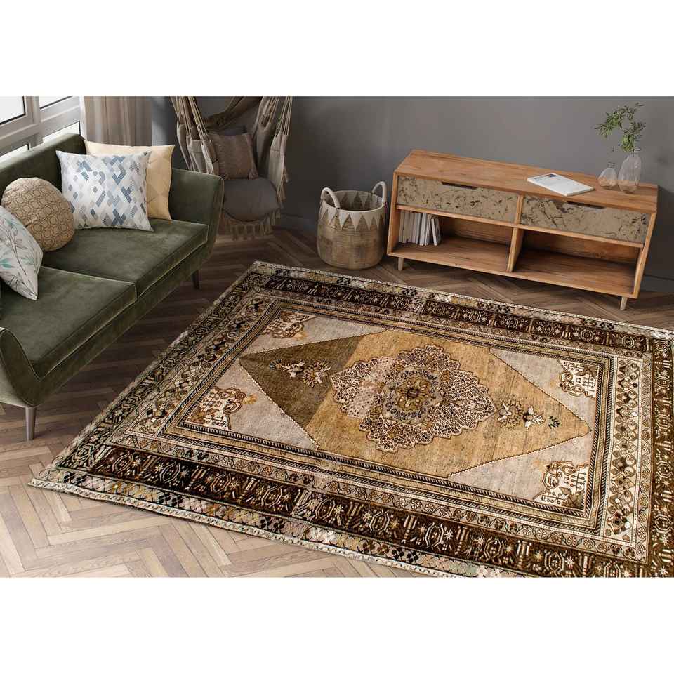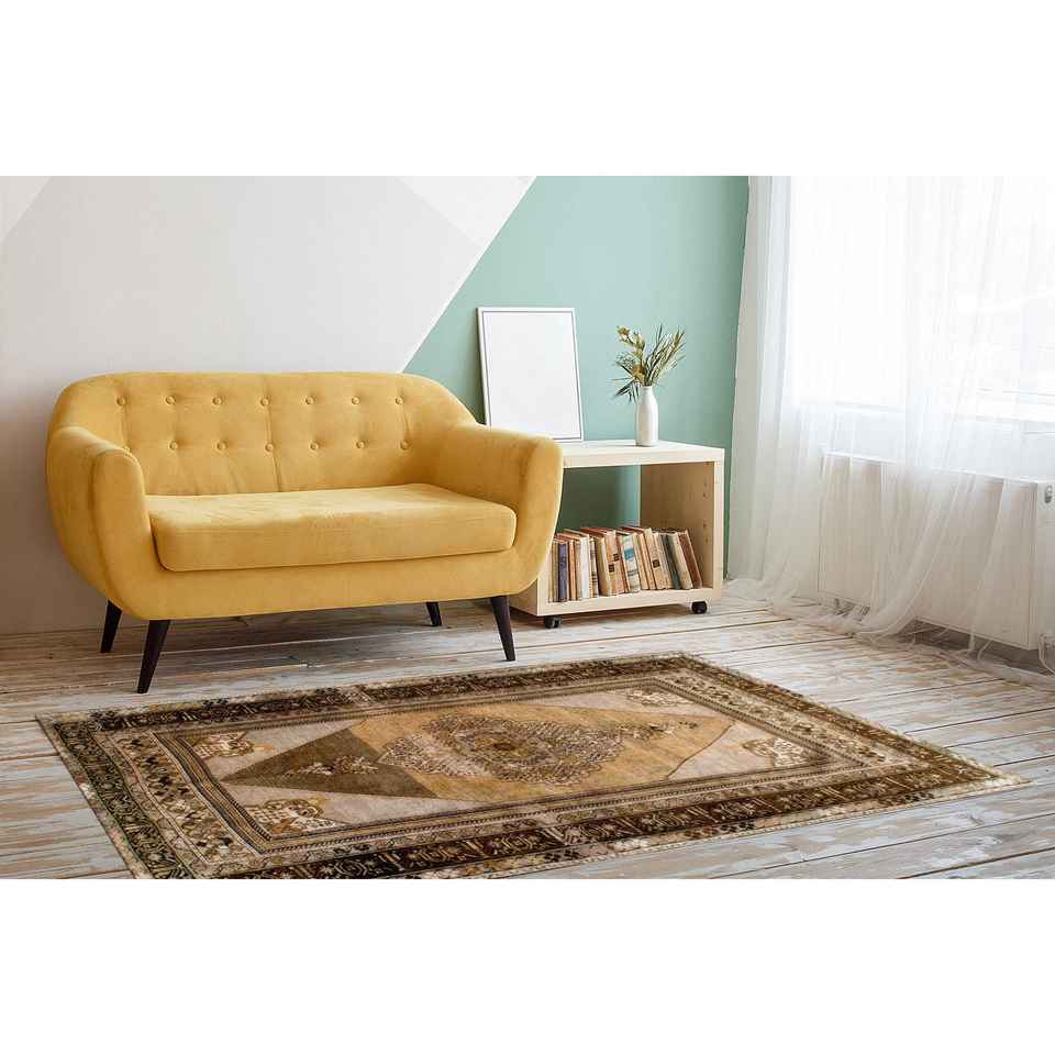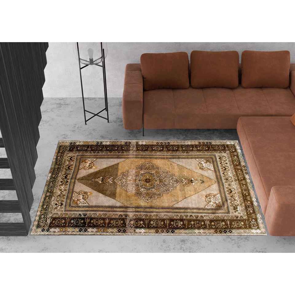 Tapis turc à médaillon brun : Tapis imprimé de style ethnique anatolien, avec poils doux