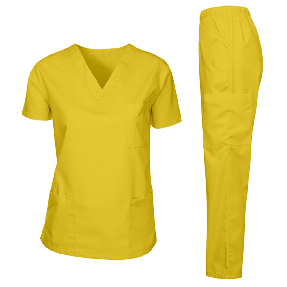 Ensemble de blouses médicales marron, haut à col en V à manches courtes avec plusieurs poches, pantalon à taille élastique, léger et respirant pour le travail quotidien