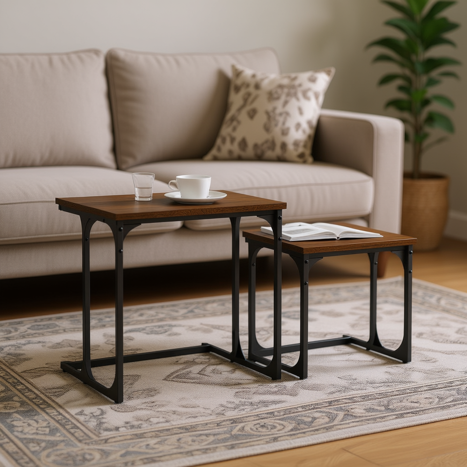 Table basse gigogne en bois d'ingénierie chêne brun avec structure métallique, mobilier de salon moderne industriel