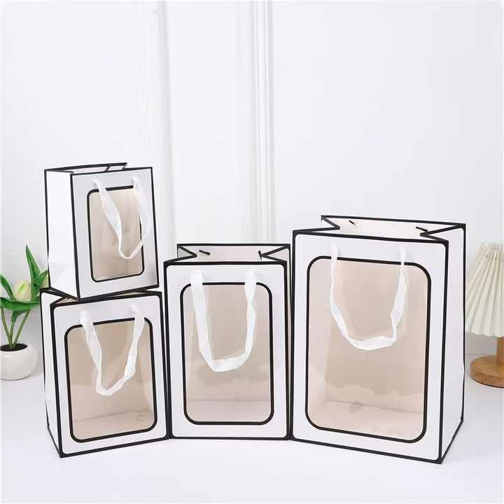 Sac en papier kraft brun avec fenêtre, sac cadeau en papier laminé avec poignées, idéal pour les supermarchés