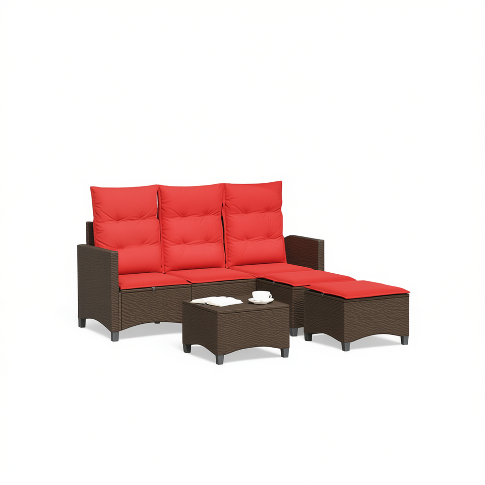 Ensemble de canapé de patio en polyrotin brun avec coussins rouges, 3 places, mobilier d'extérieur au design contemporain pour usage en terrasse
