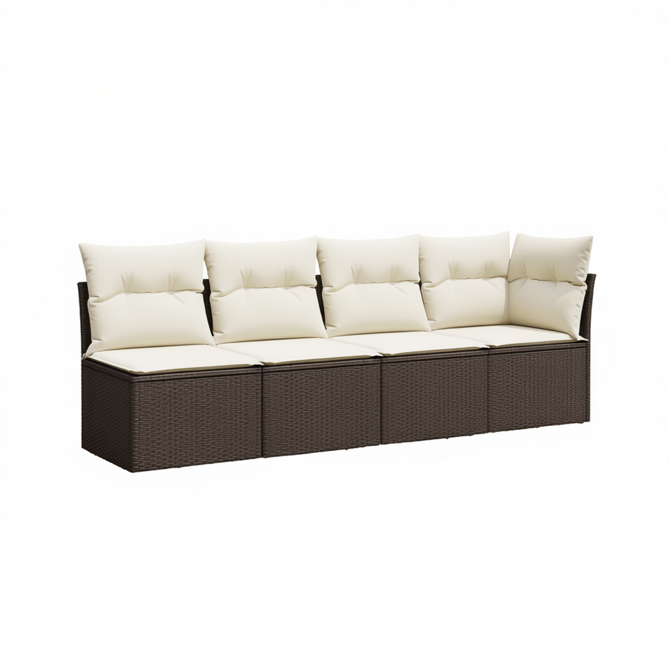 Ensemble de canapé de jardin en rotin brun trois places, mobilier d'extérieur avec coussins crème, design contemporain imperméable