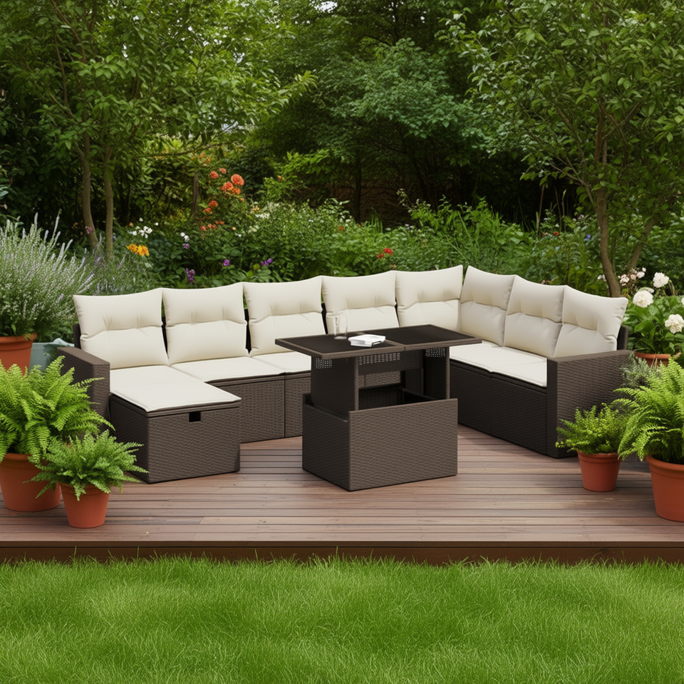 Ensemble de canapés de jardin en rotin brun avec rangement, mobilier d'extérieur au design contemporain, coussins en mousse haute densité imperméables