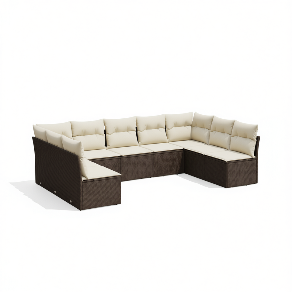 Ensemble de canapés de jardin en rotin brun avec coussins crème, mobilier d'extérieur au design contemporain, structure durable en PE tressé