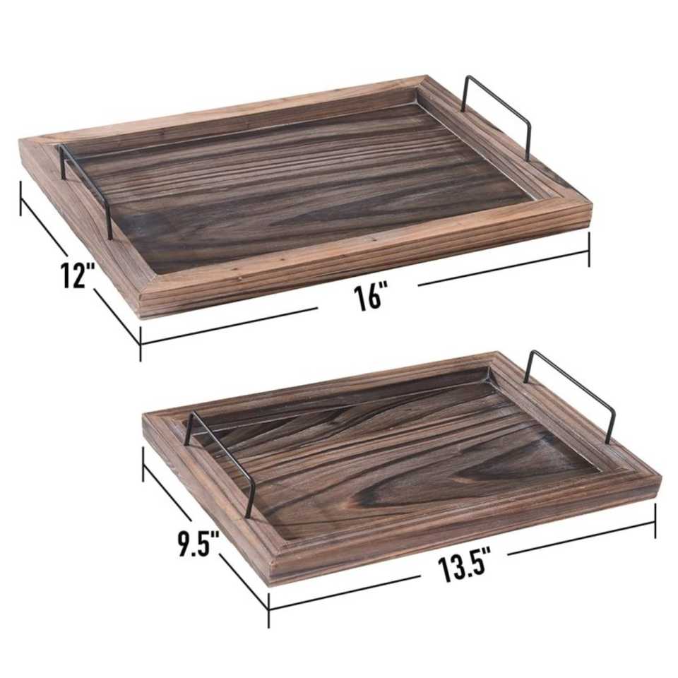 Ensemble de plateaux de service en bois rustique marron Plateau de majordome de petit-déjeuner rectangulaire avec poignées en métal
