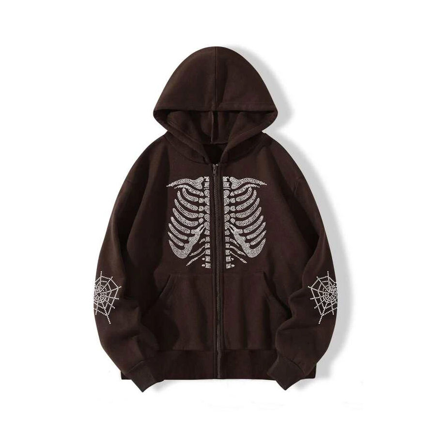 Sweat à capuche zippé marron avec cage thoracique en strass et manches en toile d'araignée, design surdimensionné unisexe, streetwear, vestes d'hiver