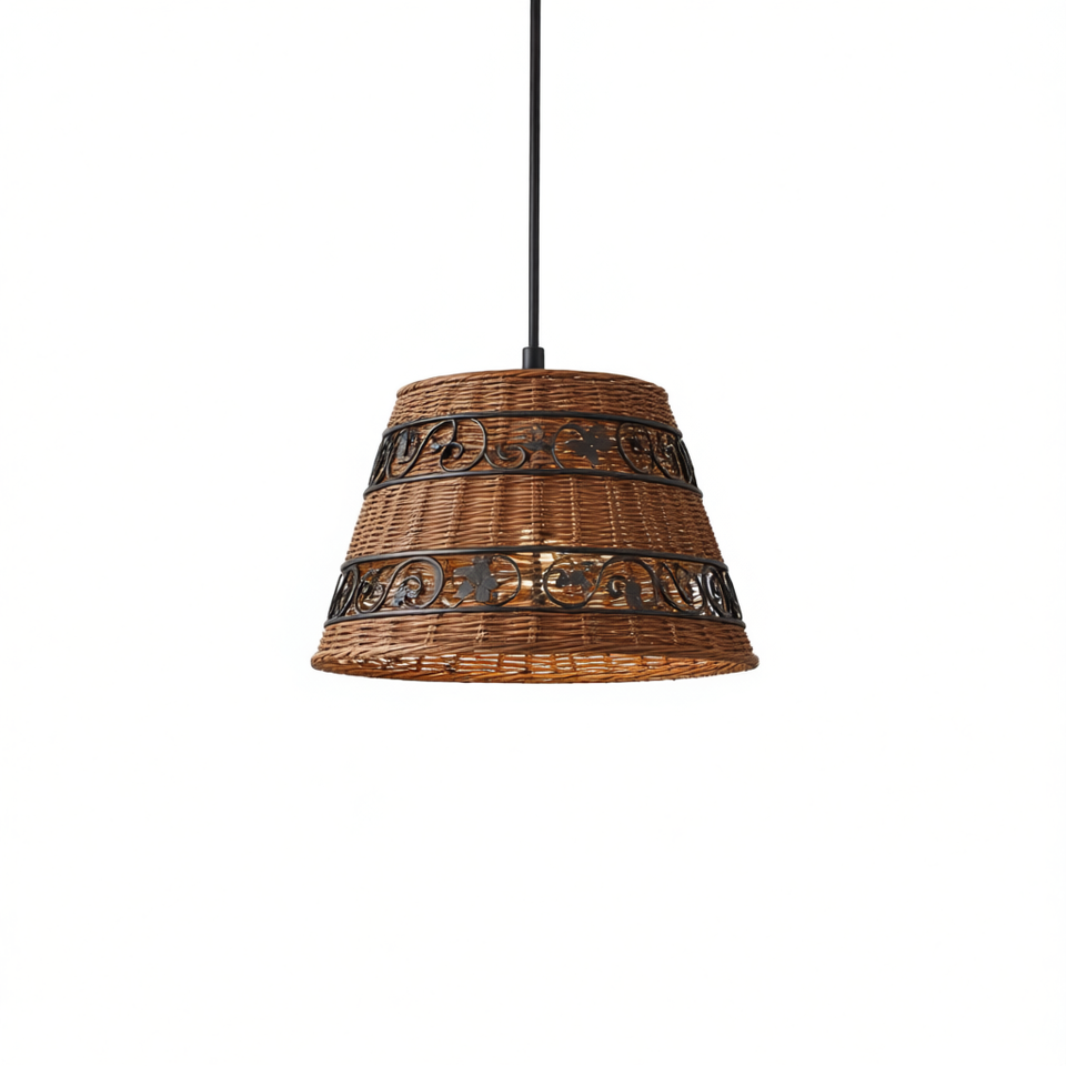 Abat-jour de plafonnier en osier marron, forme cloche moyenne, élégant, décoratif, avec incrustations en fer, couvercle de lampe