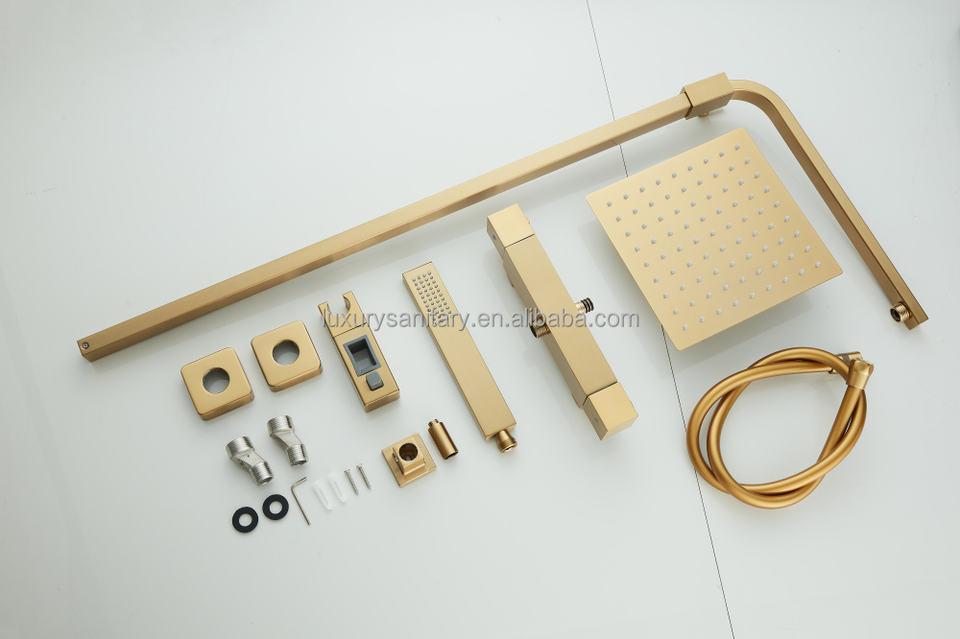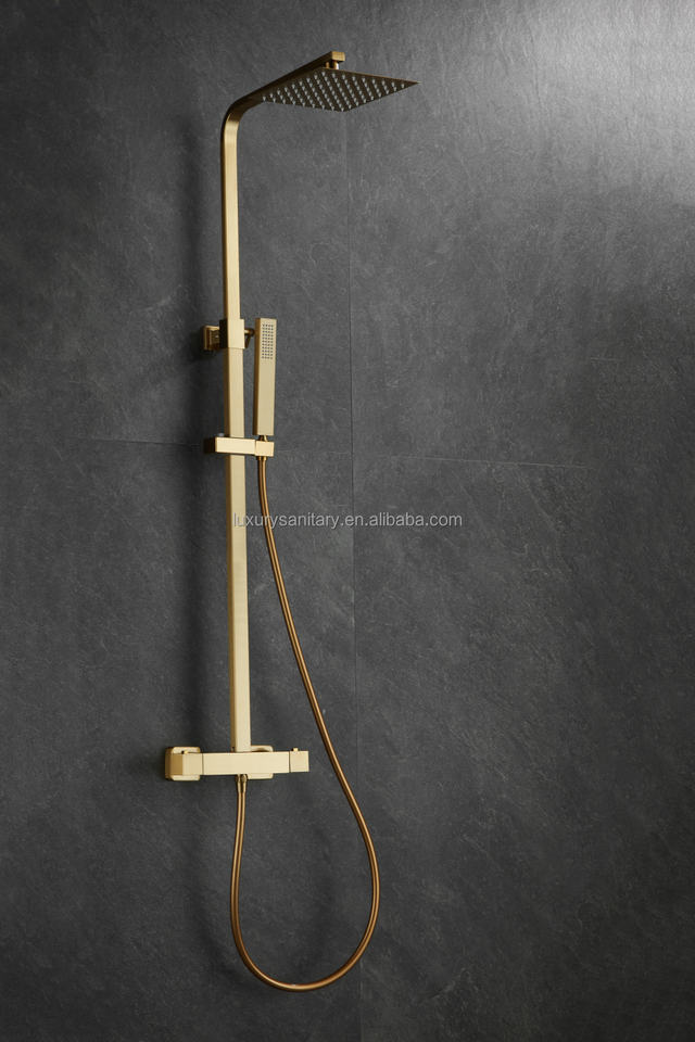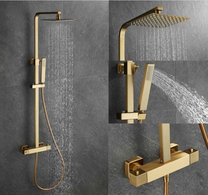 Ensemble de douche thermostatique carré en or brossé, mitigeur mural apparent avec pommeau de pluie, bec de baignoire et douchette à main