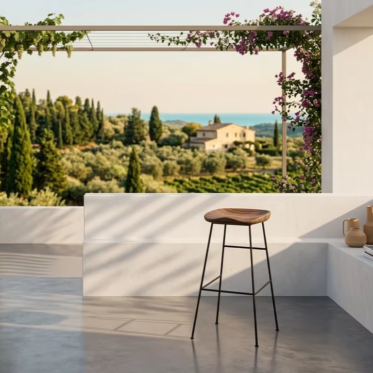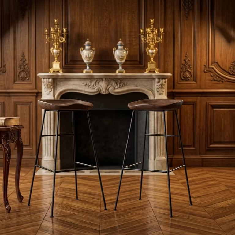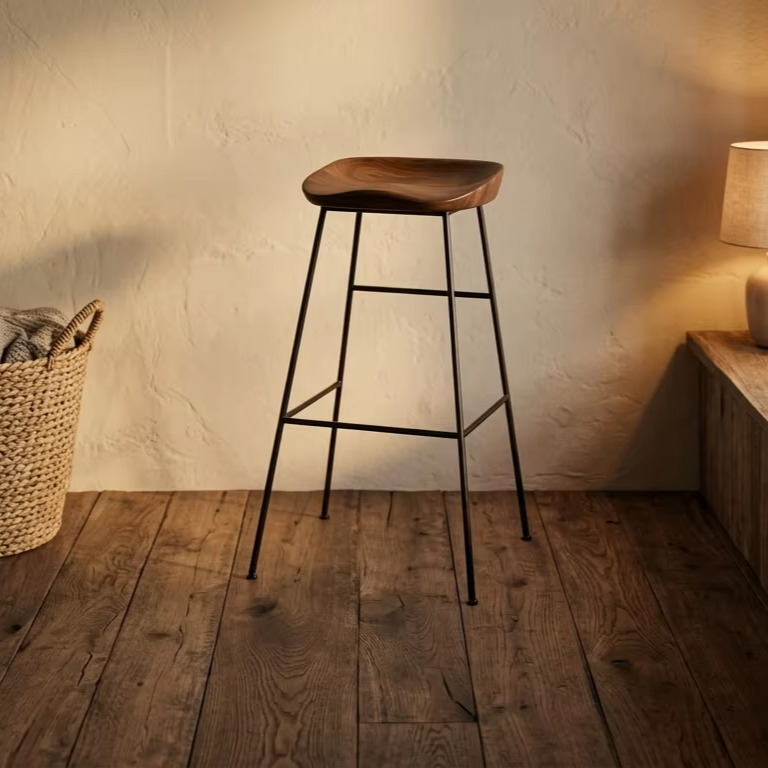 Tabouret de bar en bois massif Brusta, structure métallique, style industriel, écologique, durable, finition naturelle pour café, bar, restaurant