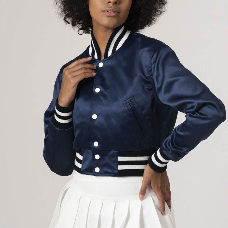 Product Name:Women Crop Satin Varsity Jacket
