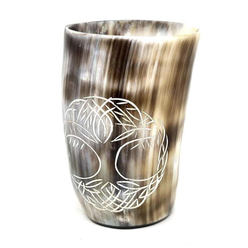 Tasse à boire artisanale en corne de buffle, motif Arbre de Vie, petite, étanche, naturelle, style Renaissance, tasse à bière en corne, art populaire, gobelet à vin gallois