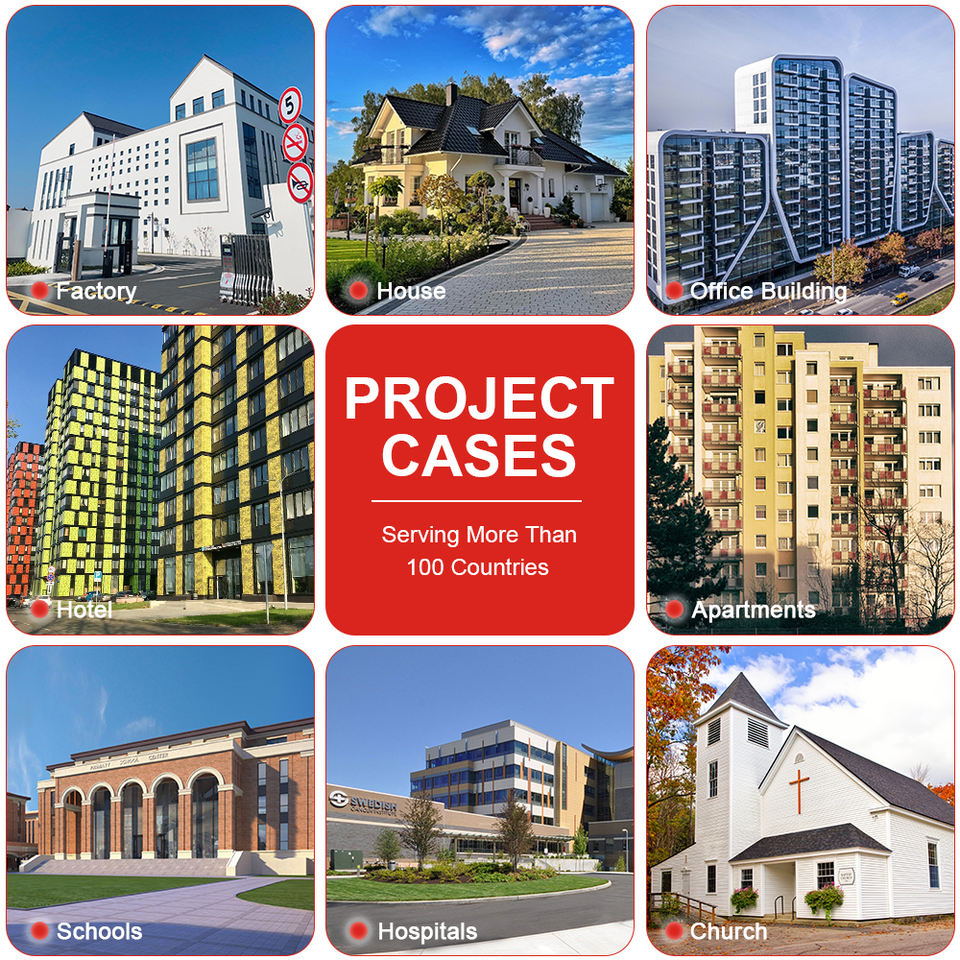 Hôtel, Villa, Appartement, Immeuble de bureaux, Hôpital, École, Center commercial, Sites sportifs, Installations de loisirs, Supermarché, Entrepôt, Atelier, Parc, Ferme, CourApplication