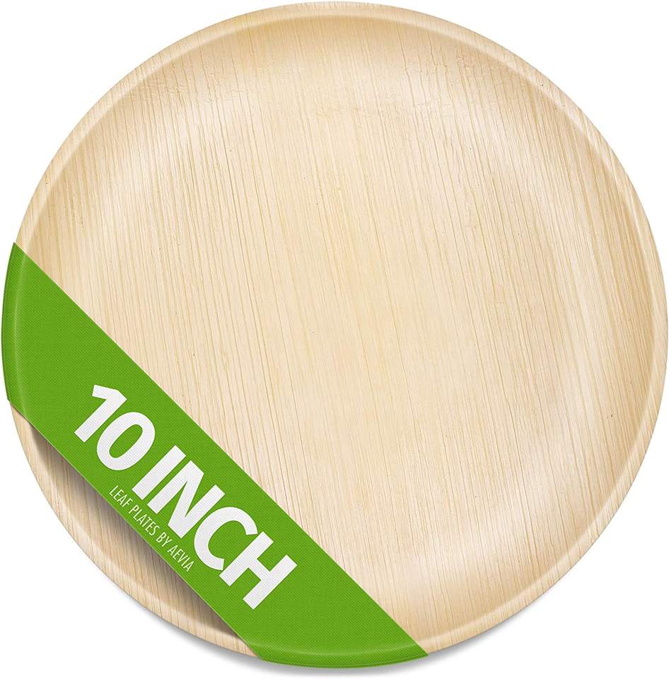Assiettes jetables en feuilles d'arec, rondes, sans produits chimiques, biodégradables, pour les food trucks et les vendeurs de festivals en plein air.