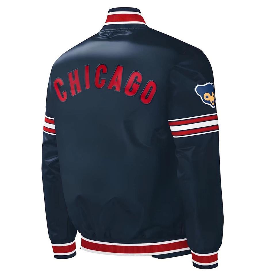 Veste en satin personnalisée en gros avec fond sublimé, lettrage brodé et écussons – Veste universitaire style Chicago Streetwear