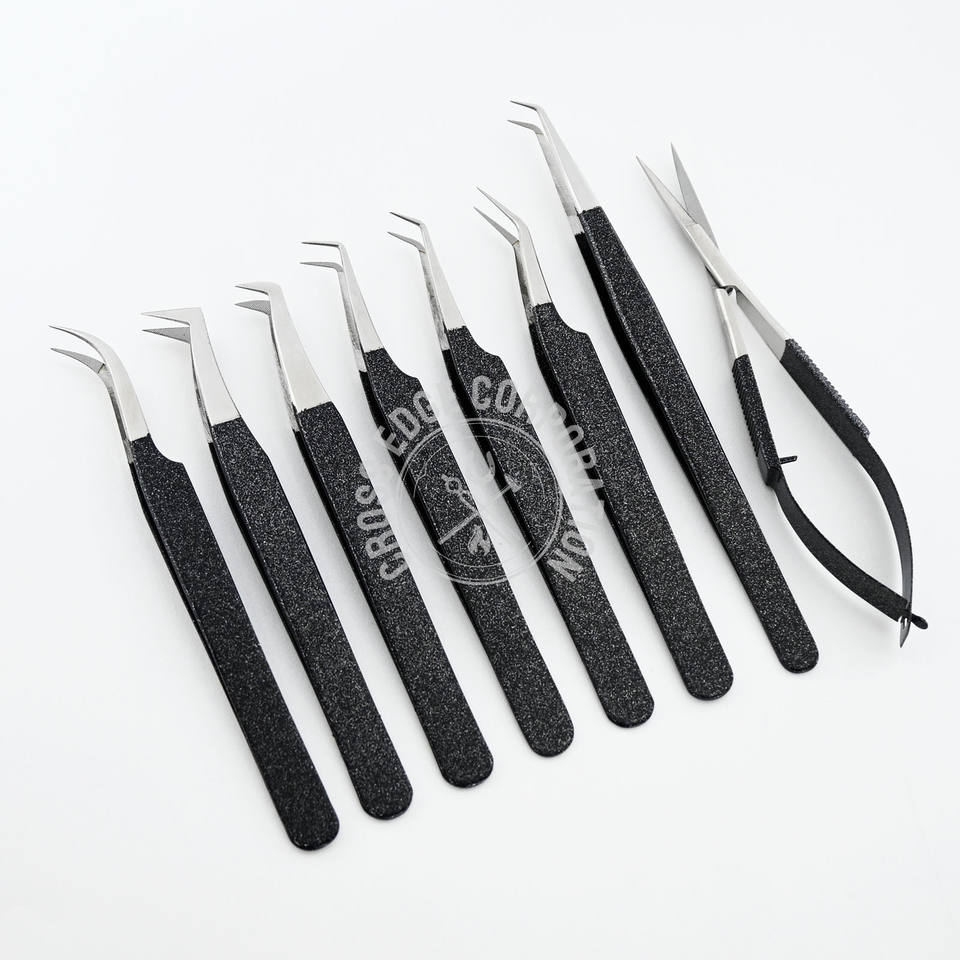 Pince à épiler pour extensions de cils, volume massif, isolation des bouquets, avec grip nano diamant en microfibre et ciseaux à ressort