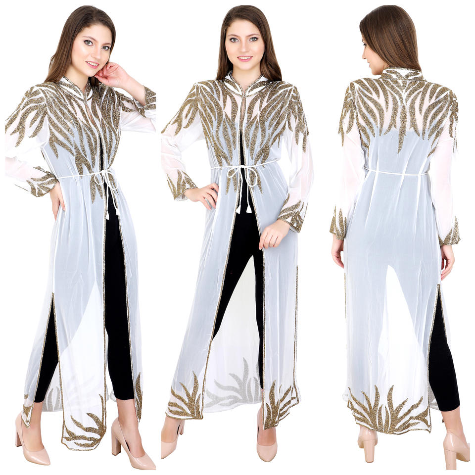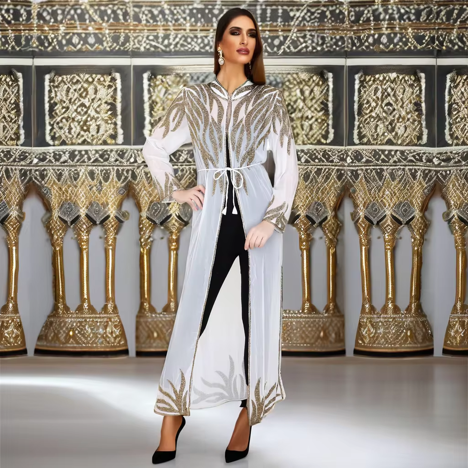 Prix en gros modeste arabe à manches longues robe de soirée perlée à la main caftan marocain avant ouvert vêtements musulmans Abaya respirant dernier