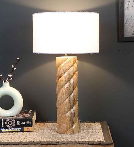 Lampe de table en bois en spirale en vrac avec abat-jour en tissu blanc | Lampe élégante en bois naturel pour chambre, bureau et hôtel