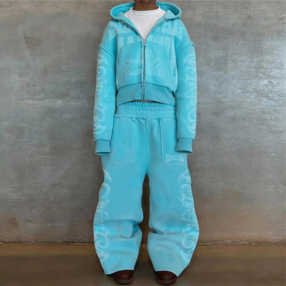 Ensemble de survêtements en coton personnalisés en gros, imprimé effet vieilli, délavé à l'acide, avec sweat à capuche zippé et pantalon de survêtement, coupe oversize pour hommes