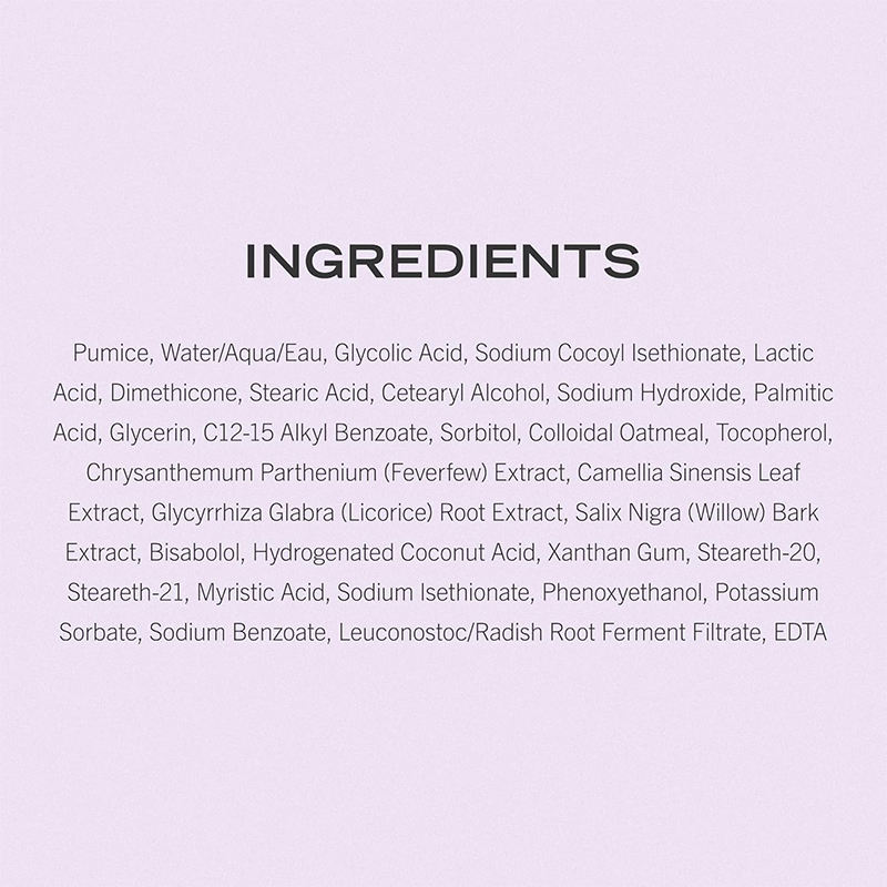 Acide salicylique, Aloe Vera, Glycérine, Acide glycolique, Pierre ponce, Huile de jojoba, beurre de karitéIngrédient