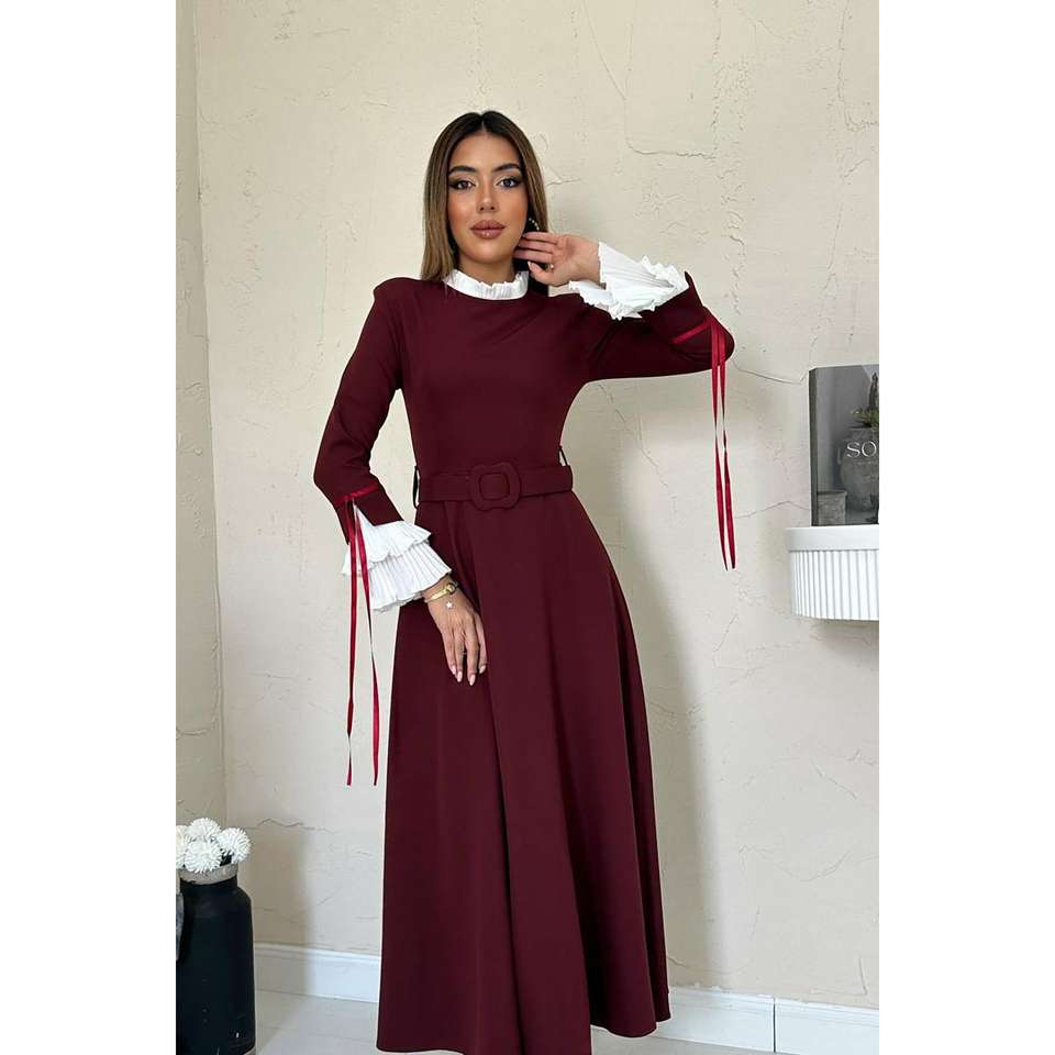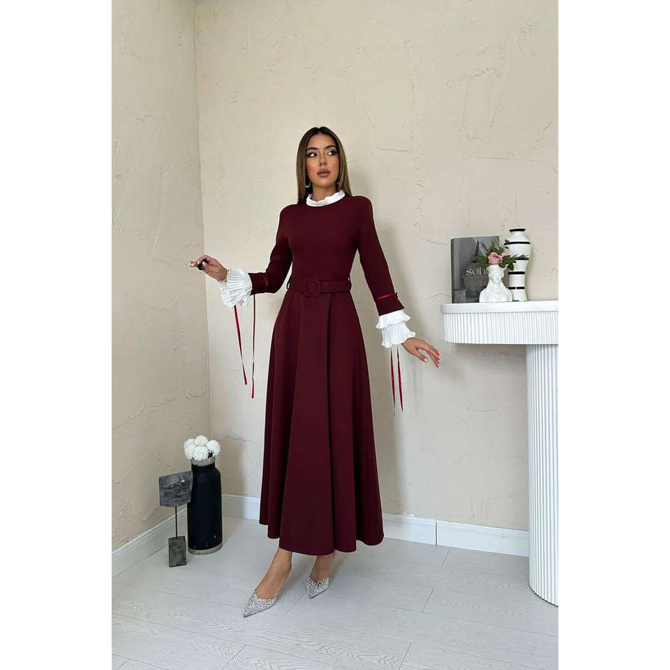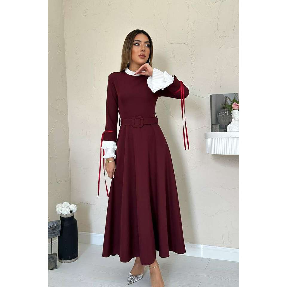 Robe de soirée bordeaux coupe trapèze avec manches contrastantes, taille naturelle, coupe confortable