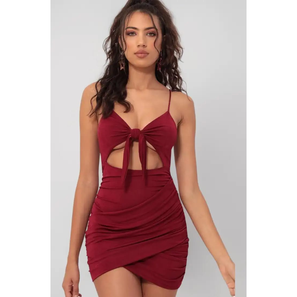 Robe mini moulante bordeaux froncée avec découpes et nœud sur le devant Audacieuse, féminine et audacieuse.