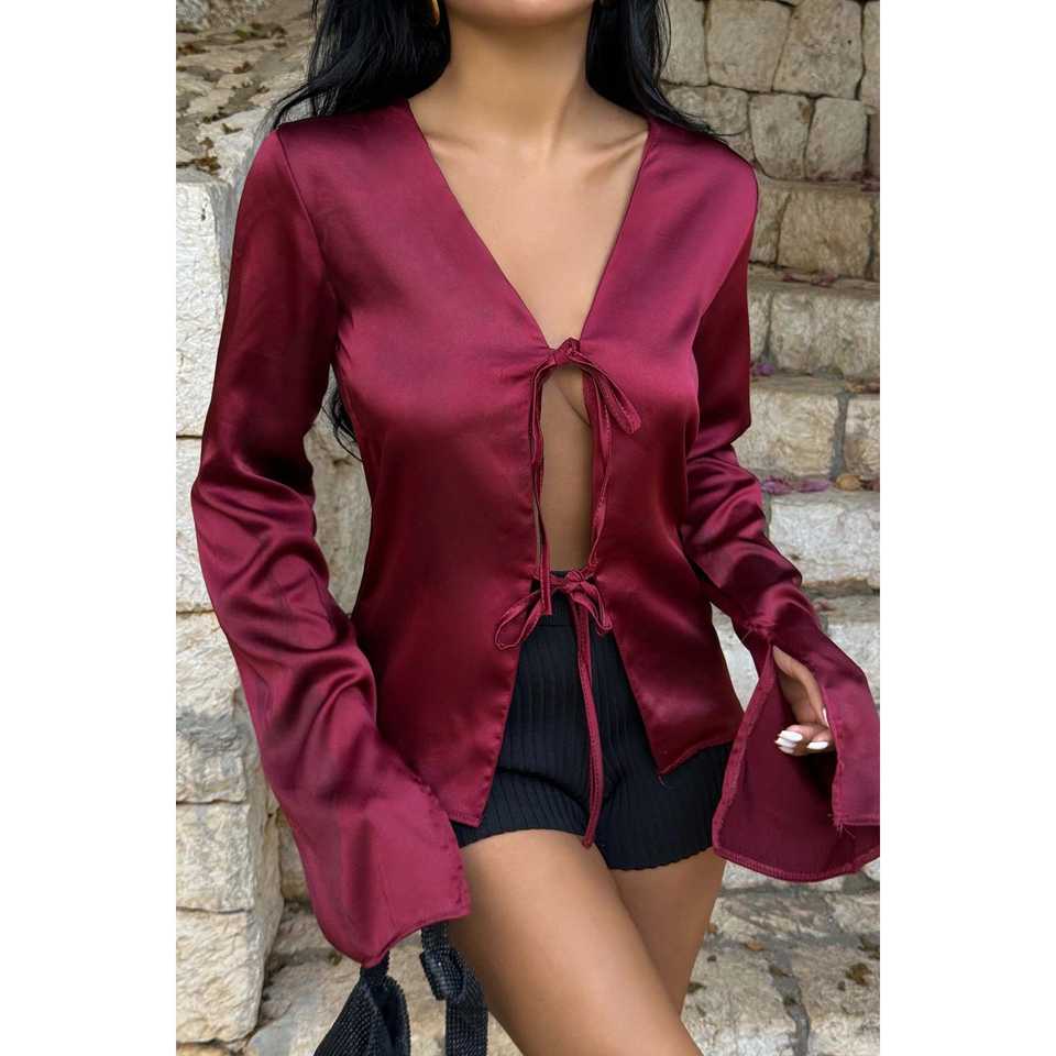 Chemise en satin bordeaux à col volanté, boutonnée, tailles XS-XL, décontractée, formelle, mode, tricotée, en mousseline de soie, respirante, unie, imprimée, usage quotidien