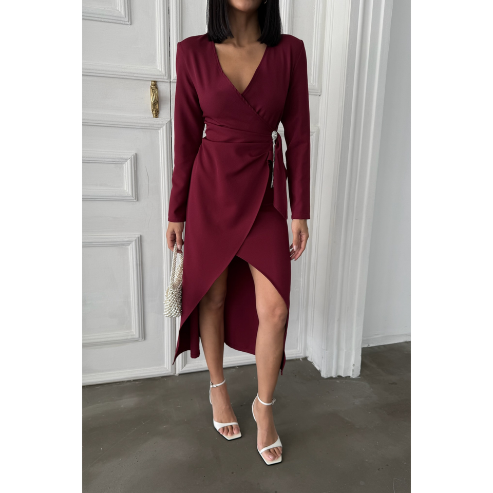 Robe de soirée brodée bordeaux style cache-cœur avec détails perlés, taille XL, coupe droite basique, style Empire court, idéale pour anniversaire