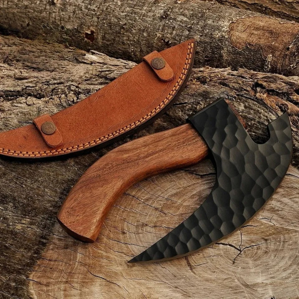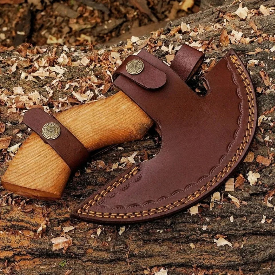 Burraq Hache à pizza Tomahawk en acier au carbone, faite à la main, avec manche en bois de rose et étui en cuir, 9 pouces, pour bricolage, usage industriel, camping et extérieur