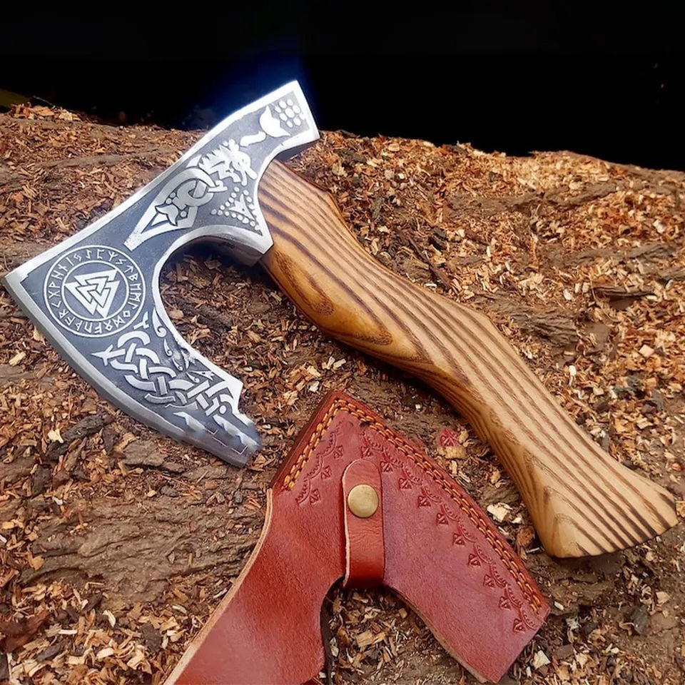Burraq Couteau Tomahawk à Pizza en Acier Carbone Fait Main Personnalisé, Manche en Bois de Palissandre, 10 Pouces, Étui en Cuir, pour Bricolage, Camping en Plein Air, Usage Industriel