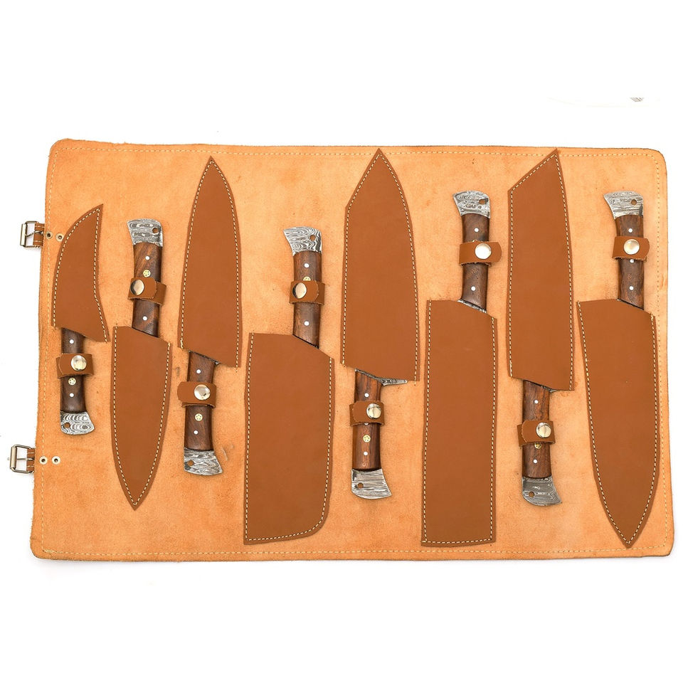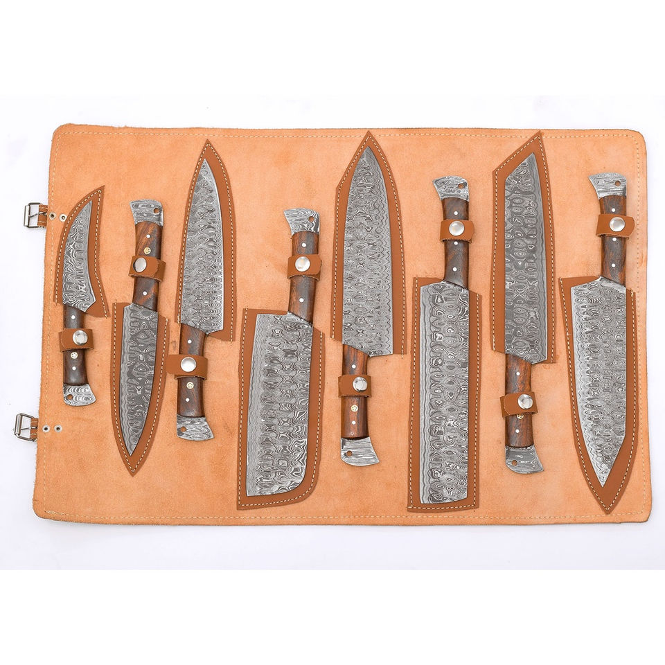 Ensemble de couteaux de chef professionnels Burraq, 8 pièces, en acier carbone Damas, fabriqués à la main, manches en bois, ambidextres, compatibles lave-vaisselle, design moderne