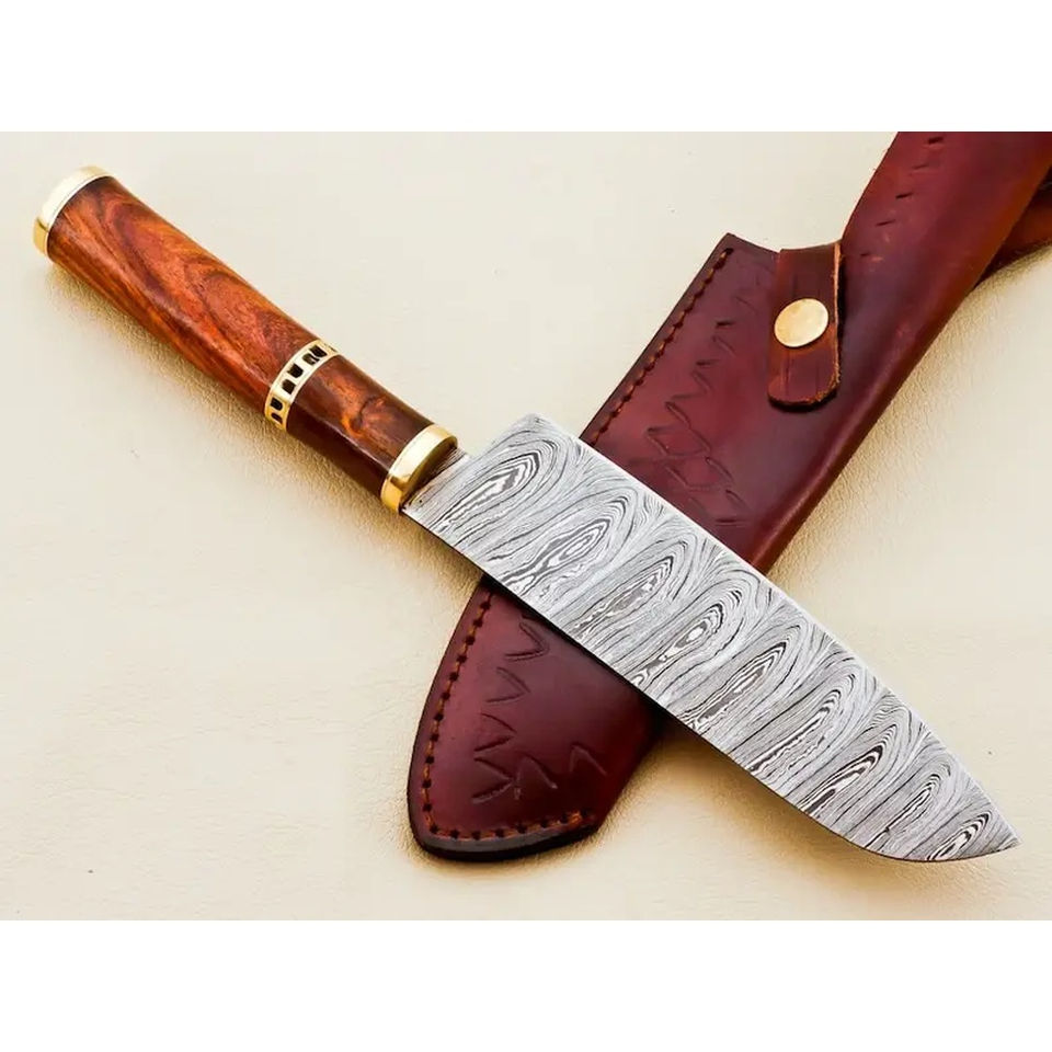 Couteau de chef moderne personnalisé fait main Burraq, lame en acier Damas, manche en bois de 8 pouces, étui en cuir, passe au lave-vaisselle