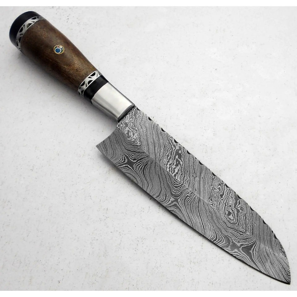 Couteau de chef moderne personnalisé fait main Burraq, lame en acier Damas de 7 pouces, épaisseur 3,0 mm, manche en bois, étui en cuir
