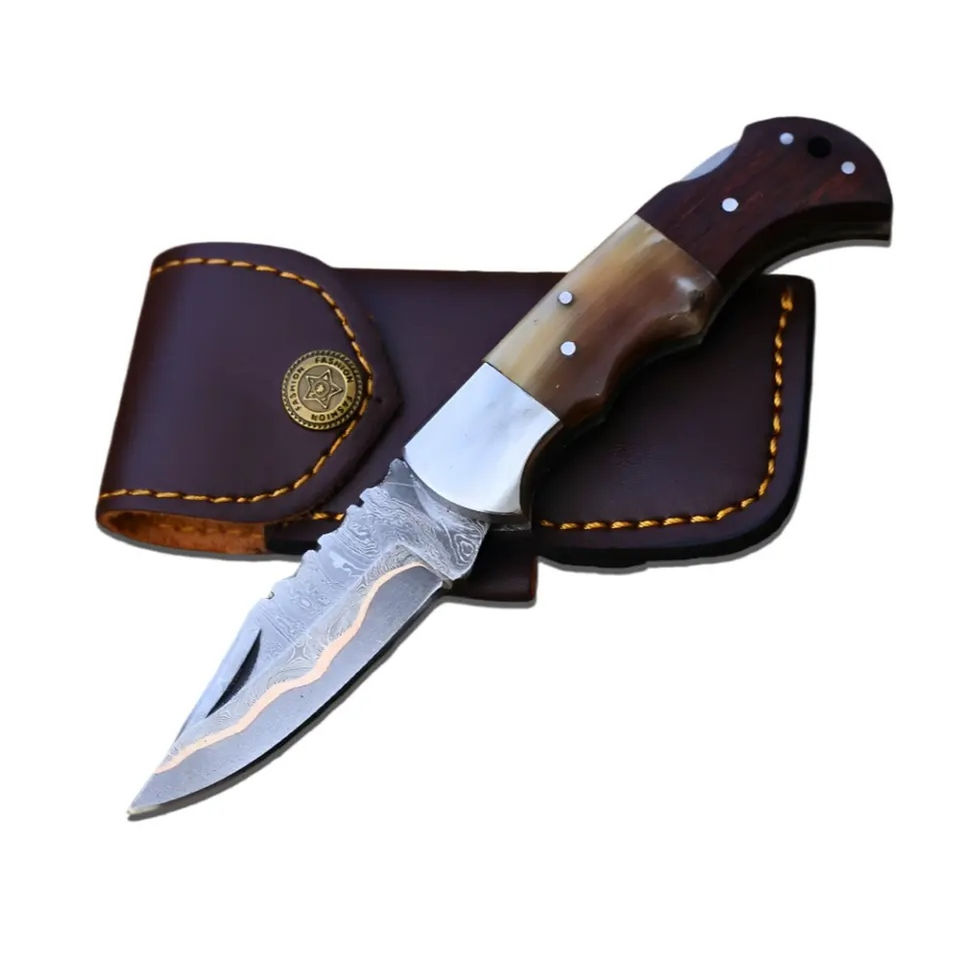 Couteau de poche à lame coulissante Burraq personnalisé OEM DIY en acier Damas fait main de 8 pouces, manche en bois, étui en cuir, cadeau d'anniversaire