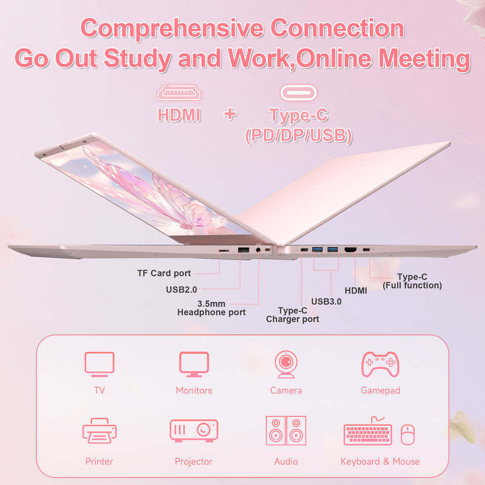 Ordinateur portable professionnel Processeur Intel Quad Core (2,66 GHz) 12 Go de RAM DDR5 512 Go de SSD Windows 10 144 Hz Clavier anglais Rose