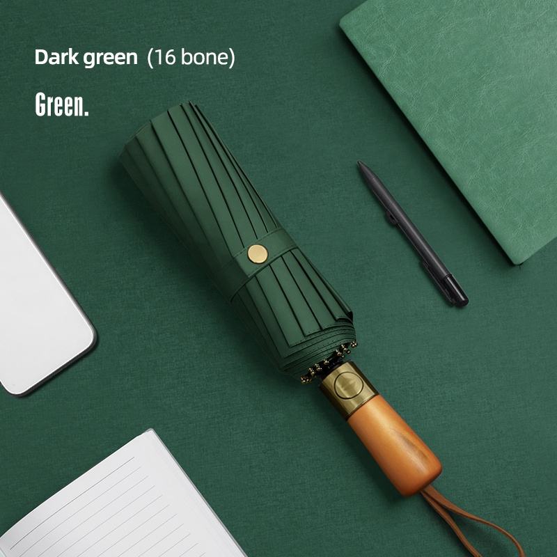 Parapluie pliant pour hommes d'affaires, renforcé, épaissi, ouverture et fermeture automatiques, manche en bois, 16 baleines, luxe haut de gamme, bouton en nylon avec or