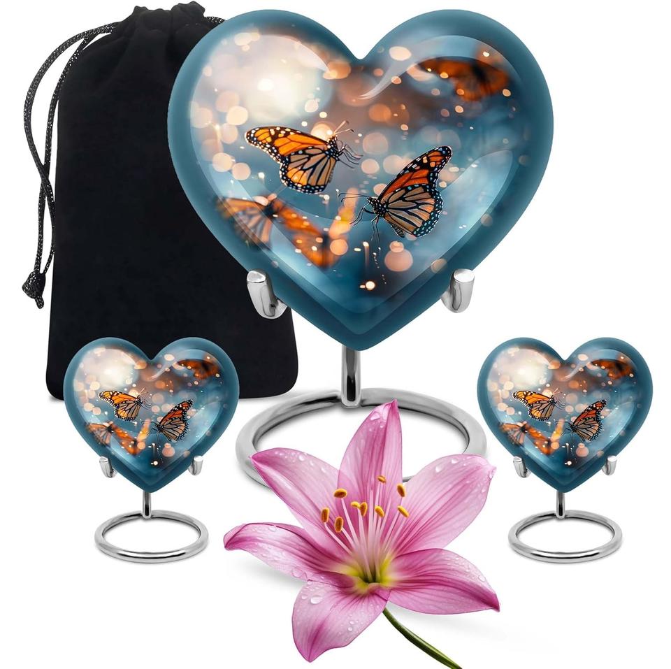 American Style Butterflies Flying Memorial Urn Combo Heart Urn & Keepsake Urn Set of 2 10 Inch Urn
