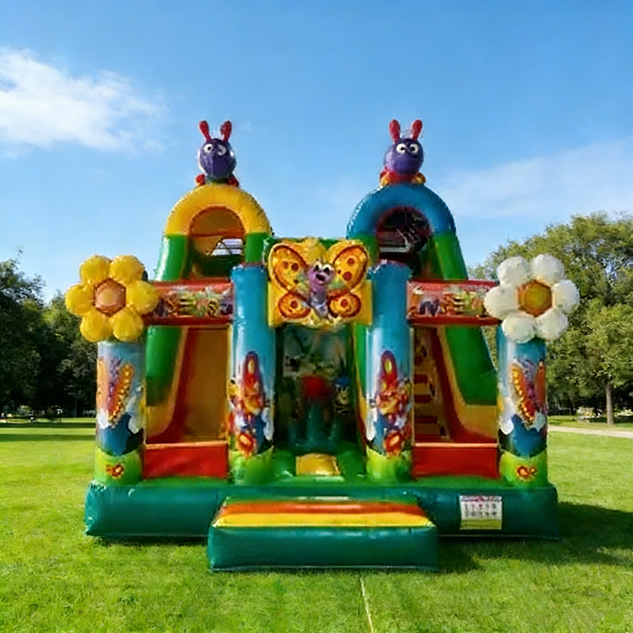 Château gonflable à thème printemps papillon et chenille avec toboggan, idéal pour les fêtes et la location