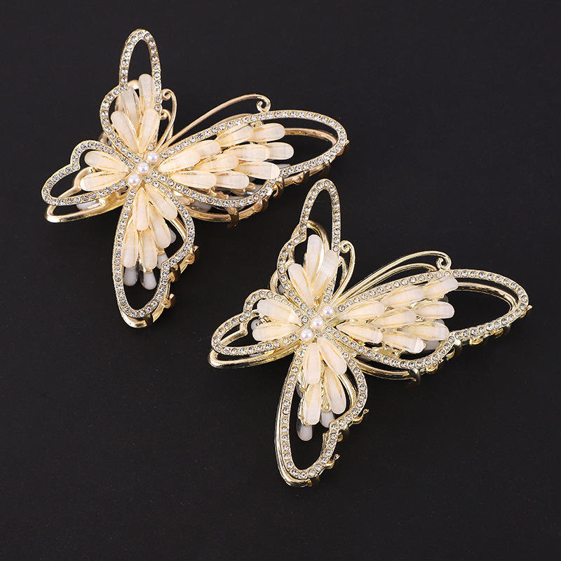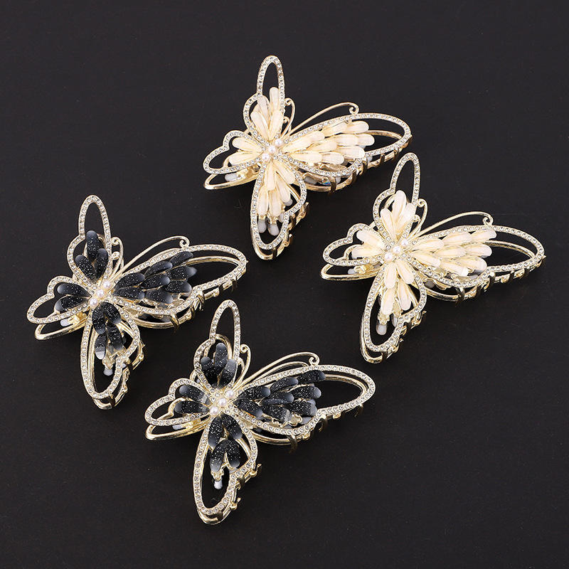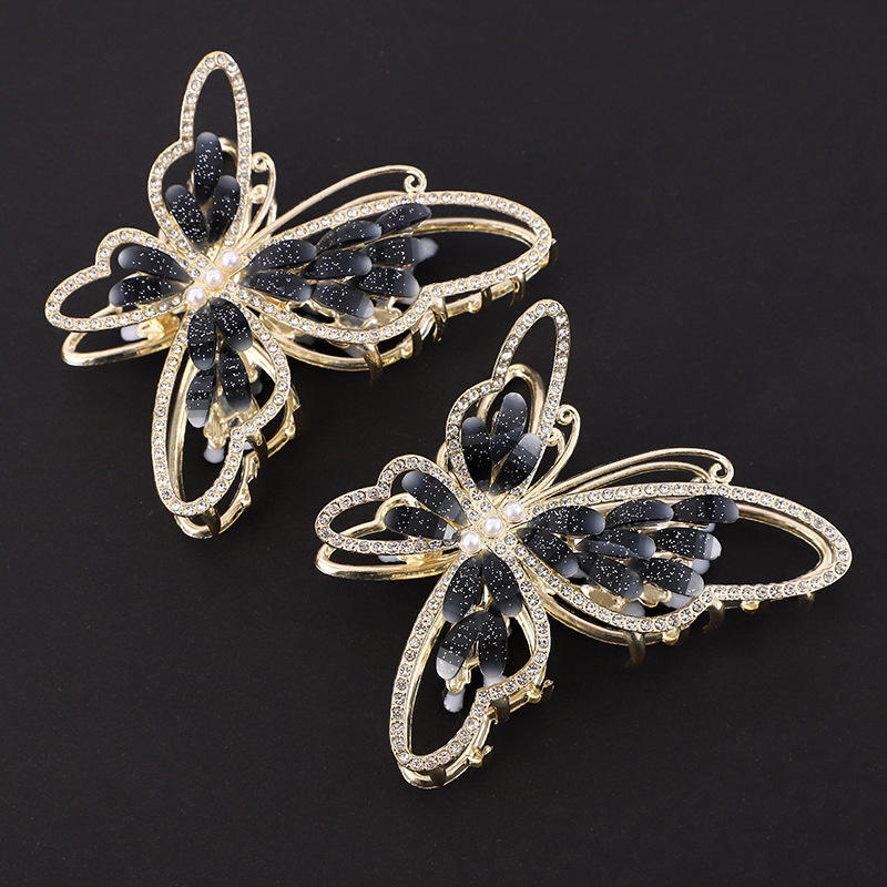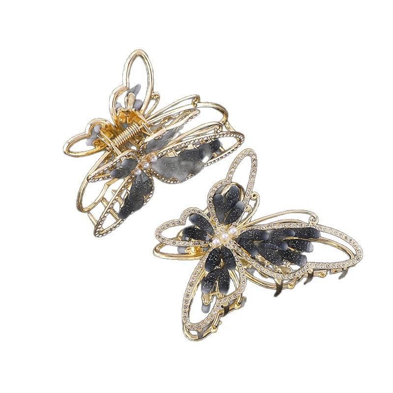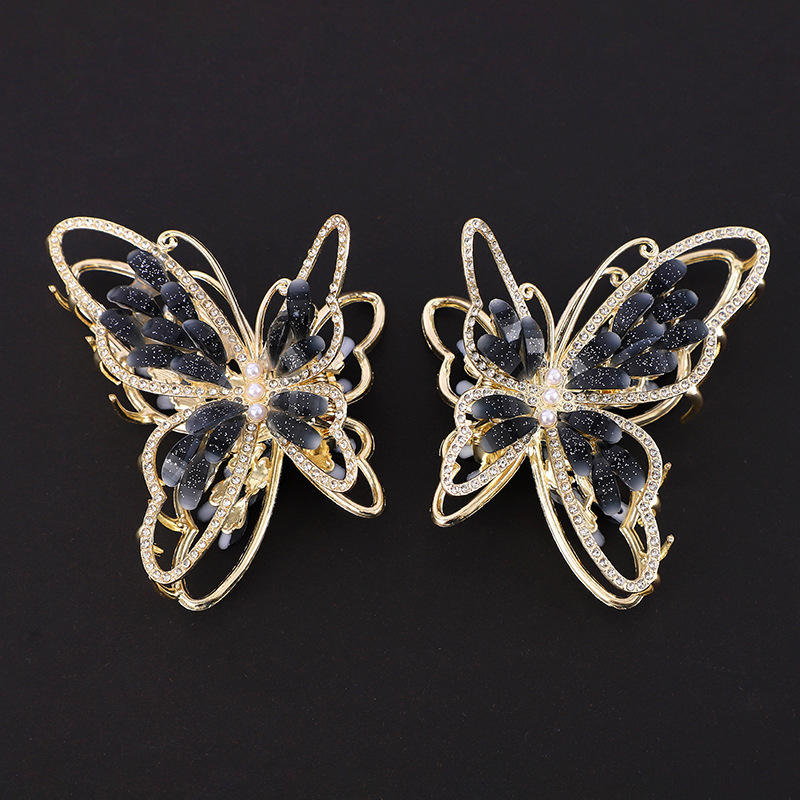 Pince à cheveux papillon dorée avec incrustation de strass noirs, accessoire de coiffure pour soirée