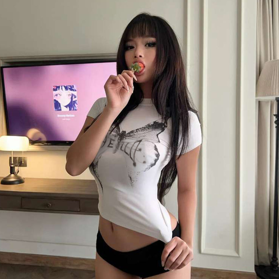 T-shirt court à manches courtes en tricot extensible respirant à imprimé papillon Y2K, couleur contrastée, décontracté, été