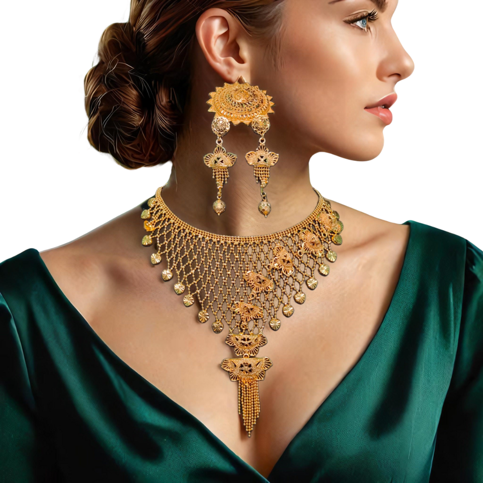 Acheter des boucles d'oreilles de qualité bague sertie d'un collier en plaqué or 22 carats ensemble de bijoux de mariée conçus traditionnels à vendre