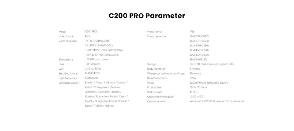 Caméra d'action de poche C200 Pro Mini caméra de casque, caméra Vlog idéale pour la plongée sous-marine, la moto et les animaux de compagnie POV