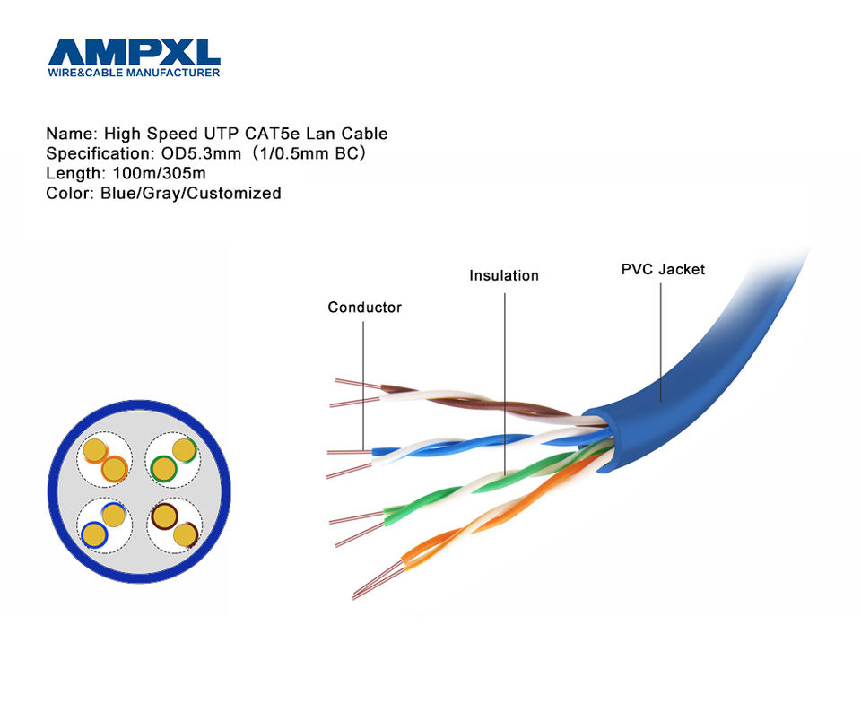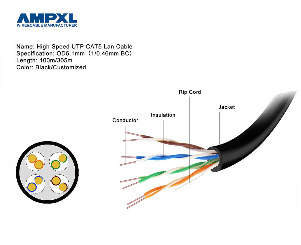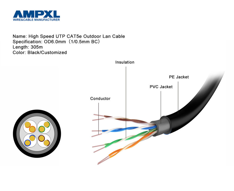 Câble réseau CAT5 UTP 24AWG 0.51mm cuivre 100m/305m/boîte de tirage Internet Rj45 cuivre pur extérieur Double gaine CCA CAT5E câble