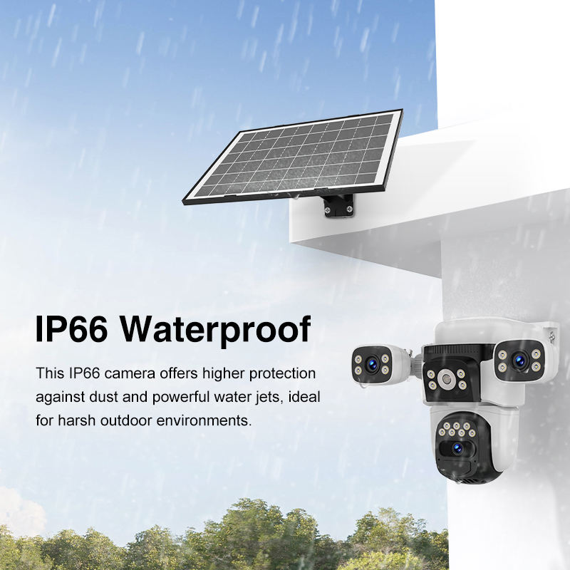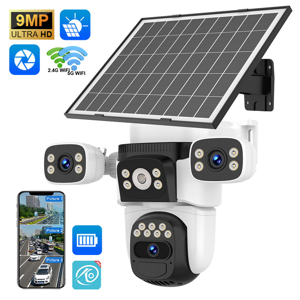 Caméra solaire PTZ CB621SR 9MP à 3 objectifs pour ferme, magasin, extérieur, Wi-Fi double bande, vue à 720°, détection humaine par IA, sirène intégrée, micro, cloud