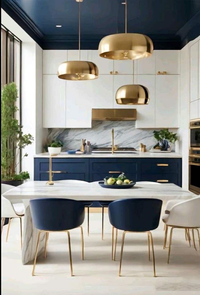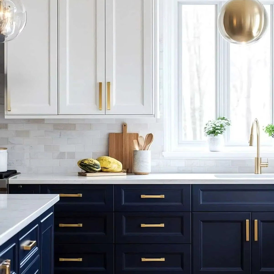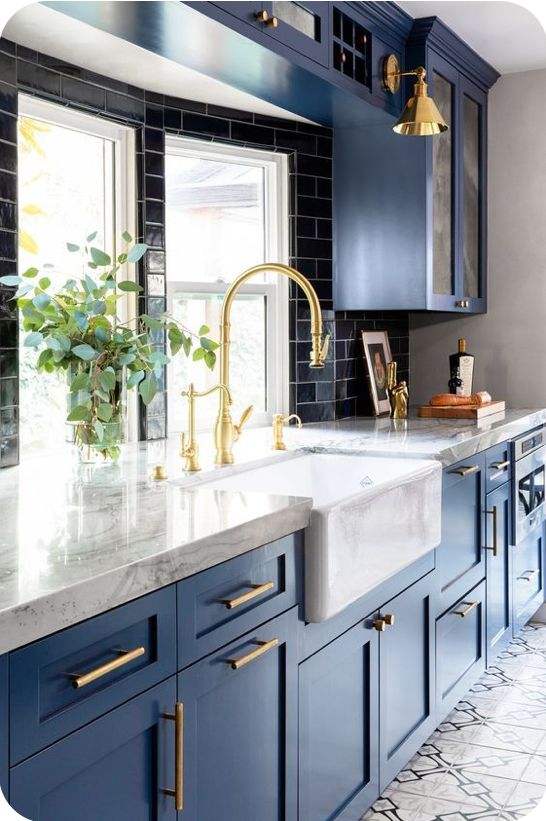 CBMMart Armoire de cuisine de style classique bleu marine avec comptoir en pierre de marbre et évier de ferme en céramique
